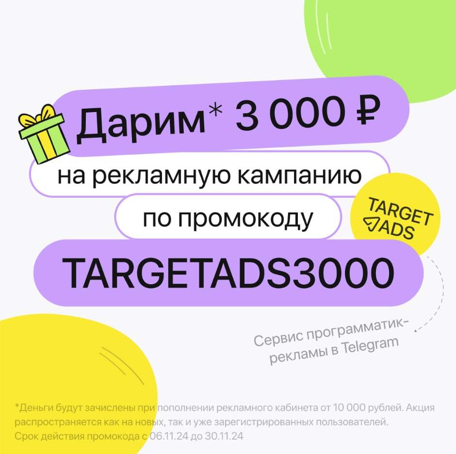 Забирайте промокод targetads3000, вводите его в окошке пополнения баланса от 10 000 рублей и запускайте свою рекламу в Telegram с бонусными деньгами, а мы позаботимся об эффективности и предоставим аналитику.